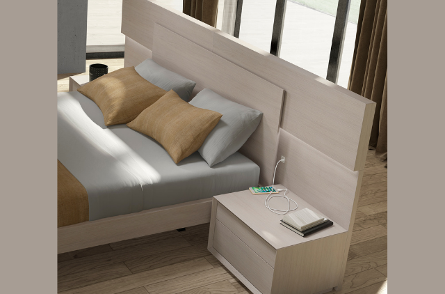 Cabecero modelo M17, para colchón de 150 cm, con unas medidas de 283 cm de ancho x 96 cm de alto x 9 cm de grueso, incorpora luz LED. Acabado F11 Decapé.