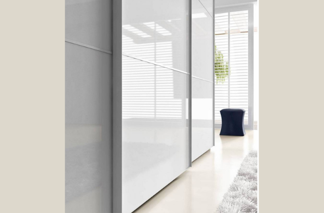 Armario 12 Amplio armario de tres puertas correderas en acabado blanco brillo, todo un acierto en línea con las últimas tendencias en decoración. El detalle de sus perfiles de aluminio a modo de tiradores marca la diferencia.