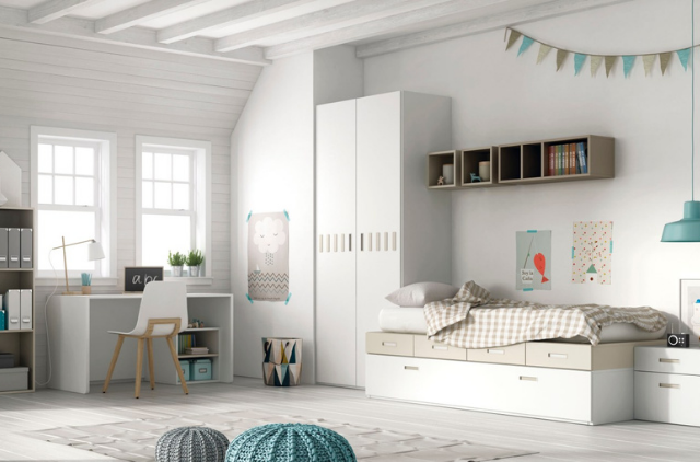 Dormitorio infantil evolutivo, consiste en un programa adaptado a tus necesidades donde la funcionalidad se combina con la estética y el buen gusto. Esta composición podrá acompañar a tu hijos desde la cuna hasta la adolescencia.