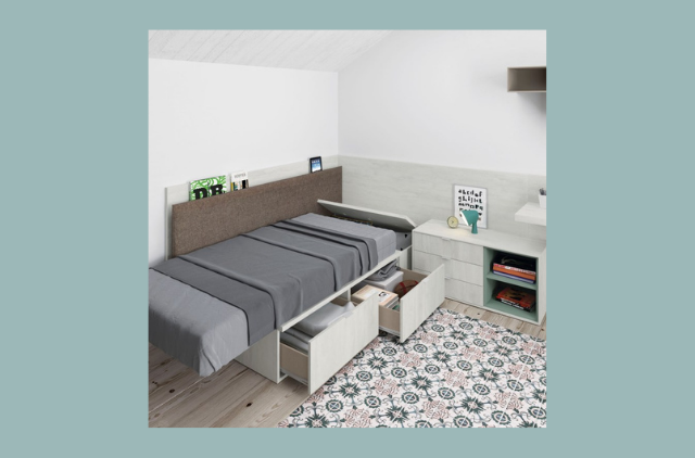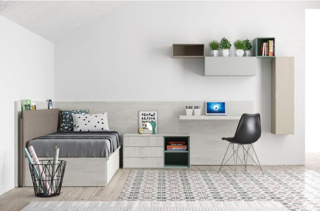 Dormitorio juvenil, ideal para espacios reducidos pero sin perder la capacidad organizativa y de almacenaje.