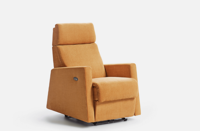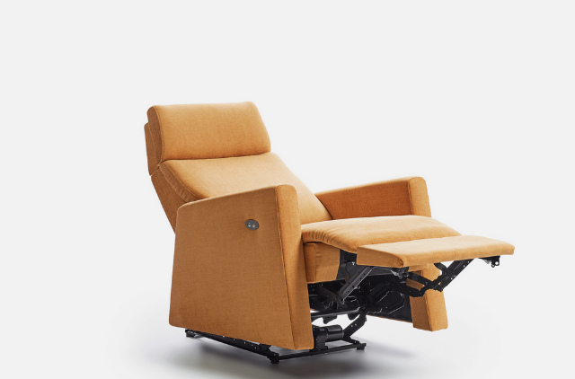 Butaca reclinable de líneas rectas en la que sus piezas, desde el cabezal hasta el asiento y el reposapiés está equilibrado.