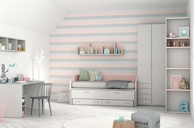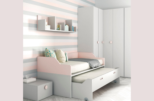 Dormitorio infantil evolutivo, consiste en un programa adaptado a tus necesidades donde la funcionalidad se combina con la estética y el buen gusto. Esta composición podrá acompañar a tu hijos desde la cuna hasta la adolescencia.