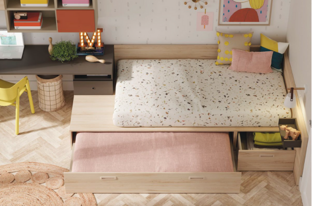 Dormitorio juvenil, donde un conjunto de cajas permiten modelar composiciones ajustadas en función del espacio, confort y almacenaje.
