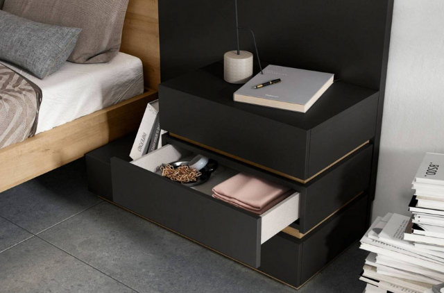 Este dormitorio es la combinación perfecta de colores Canela y Petrol. Cuenta con mesillas apilables de la serie UP y un cabecero FLAT jugando con el tapizado Gris Oscuro en una de las alas LIVING.